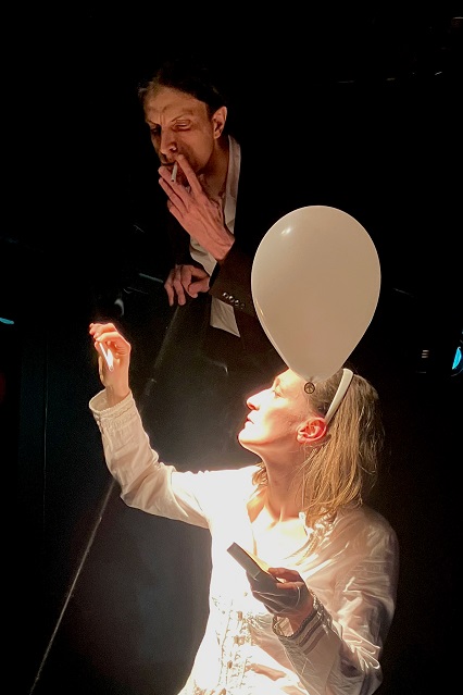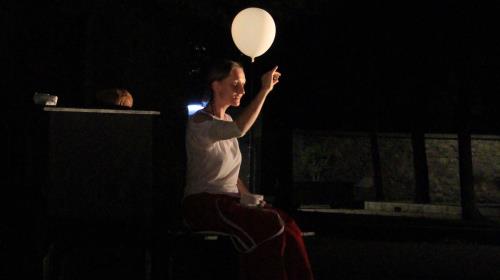 Durante lo spettacolo, immaginato per spazi aperti e bui, una figura bianca si muove con fare fanciullesco ed un gigantesco giovane sui trampoli interagisce muto con lei.