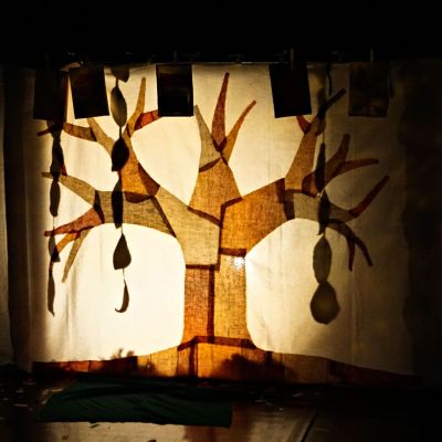 Diversi libretti disseminati per la scena: dentro, sopra e attorno al vecchio ciliegio che stuzzicato da un raggio di sole e da una dispettosa formichina si sveglia dal suo lungo sonno e durante il racconto cambia più volte abito.